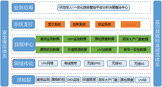 基于物联网、互联网、大数据等技术手段,建立“天地车人”一体化综合管控平台,平台系统架构由两个体系、五层结构组成,实现移动污染源从监测到分析决策及最后整治的闭环管理。
